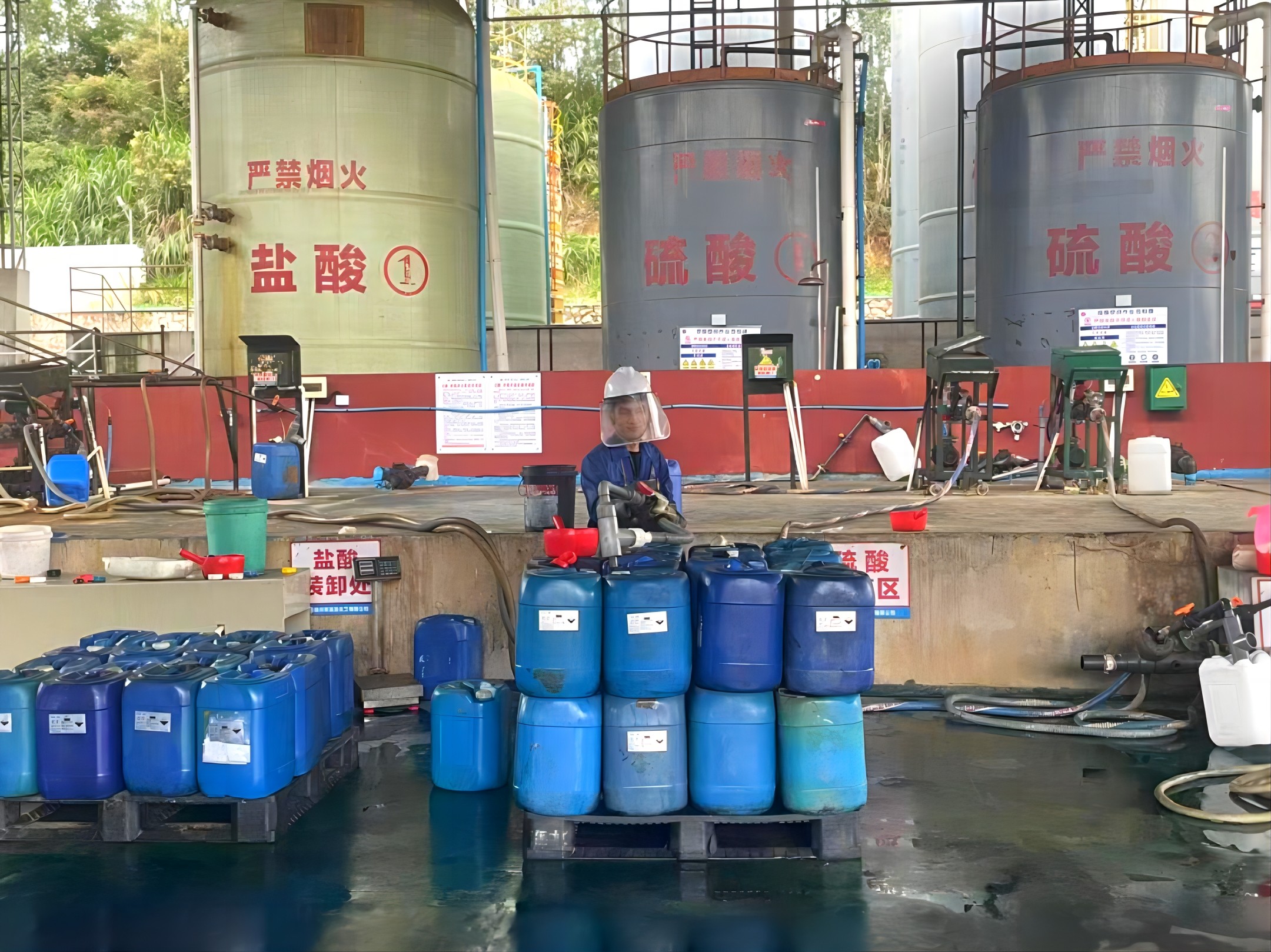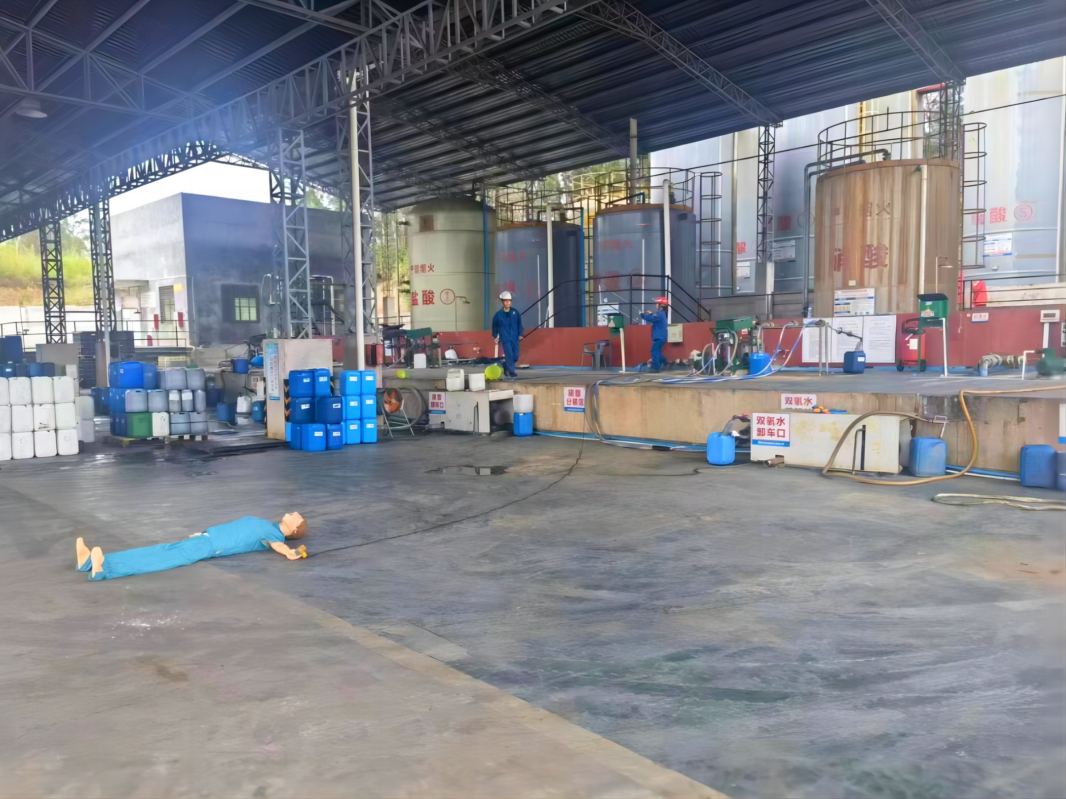 模擬車(chē)間人員因操作不慎,硫酸飛濺到身上,迅速脫去身上被污染的衣服,迅速關(guān)閉充裝開(kāi)關(guān),用毛巾擦干凈后安排到淋浴器進(jìn)行沖洗,沖洗時(shí)間30分鐘以上并涂燙傷膏。